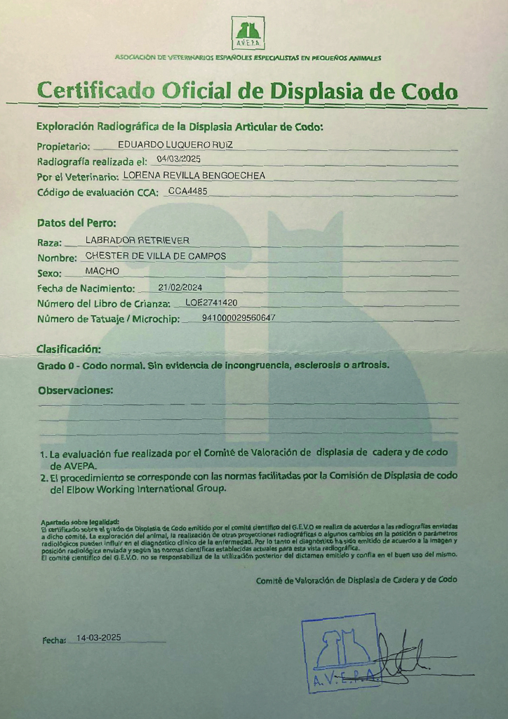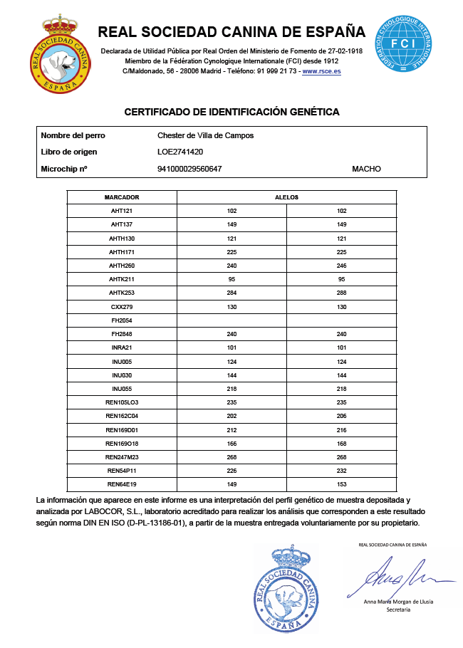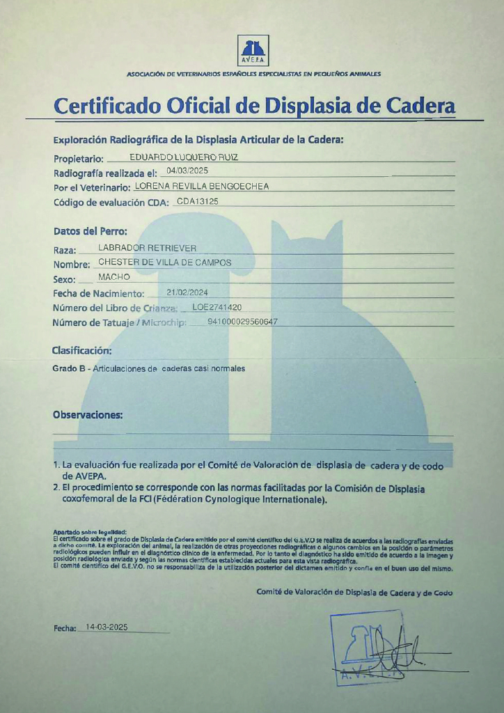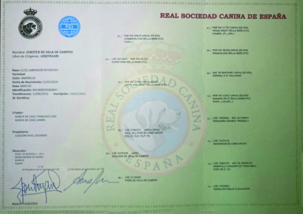 Desde esta página, puedes ver todos los documentos: Pedigrees, Certificados Oficiales de Displasia de Cadera, Certificados Oficiales de Displasia de Codo, etc...